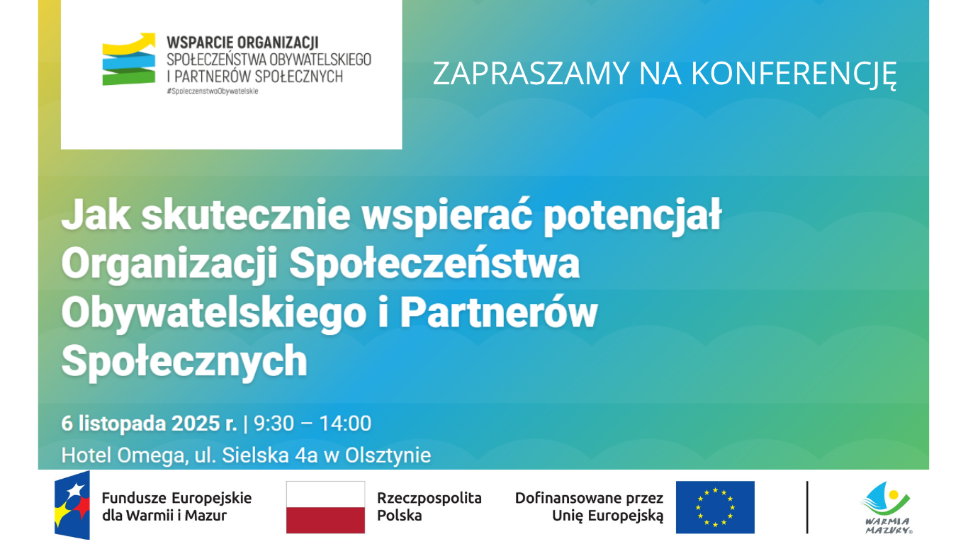Czytaj więcej: Konferencja w projekcie strategicznym Samorządu Województwa Warmińsko-Mazurskiego pn. „Wsparcie Organizacji Społeczeństwa Obywatelskiego i Partnerów Społecznych”Konferencja w projekcie strategicznym Samorządu Województwa Warmińsko-Mazurskiego pn. „Wsparcie Organizacji Społeczeństwa Obywatelskiego i Partnerów Społecznych”